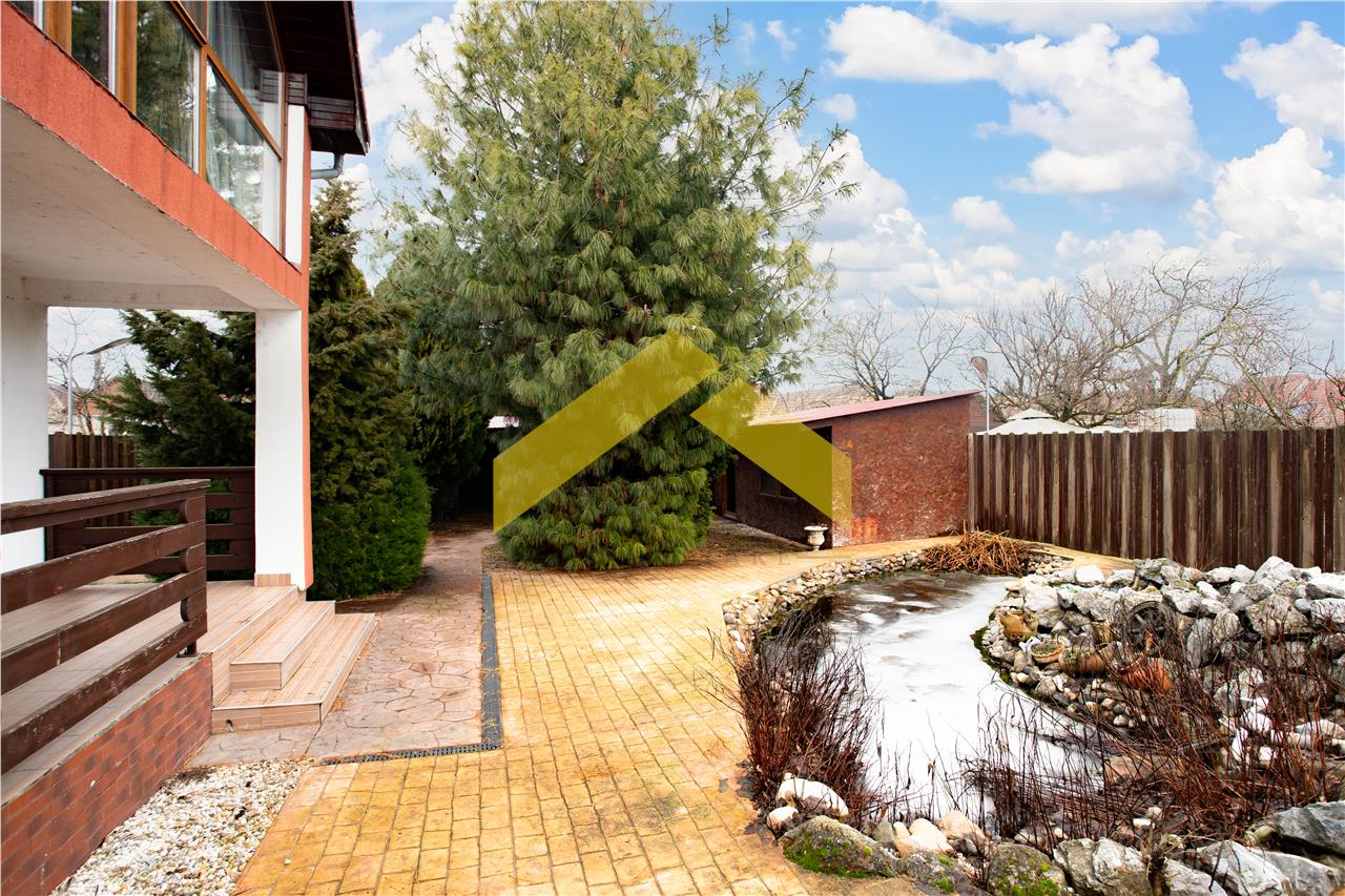 -un iaz cu pesti ornamentali si cascada cu pompe de recirculare a apei